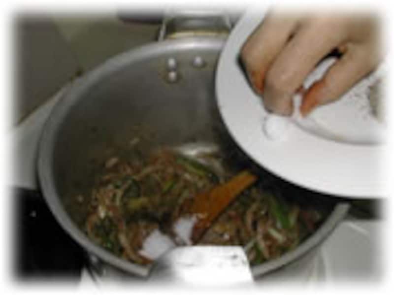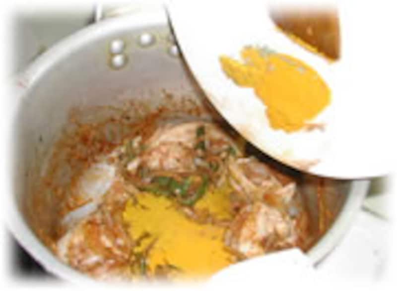 5:弱火のままで、香辛料(3)のカレーパウダー、ターメリック、粗引き黒コショウを加え、よく混ぜ合わせます。 |