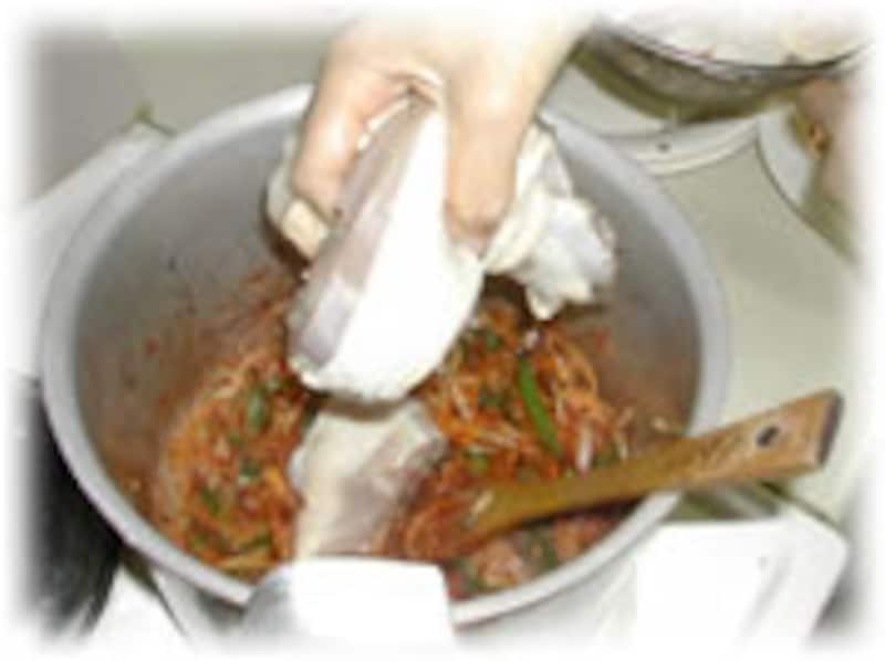 | 4:野菜を炒め終わったら、鶏肉を入れます。 |