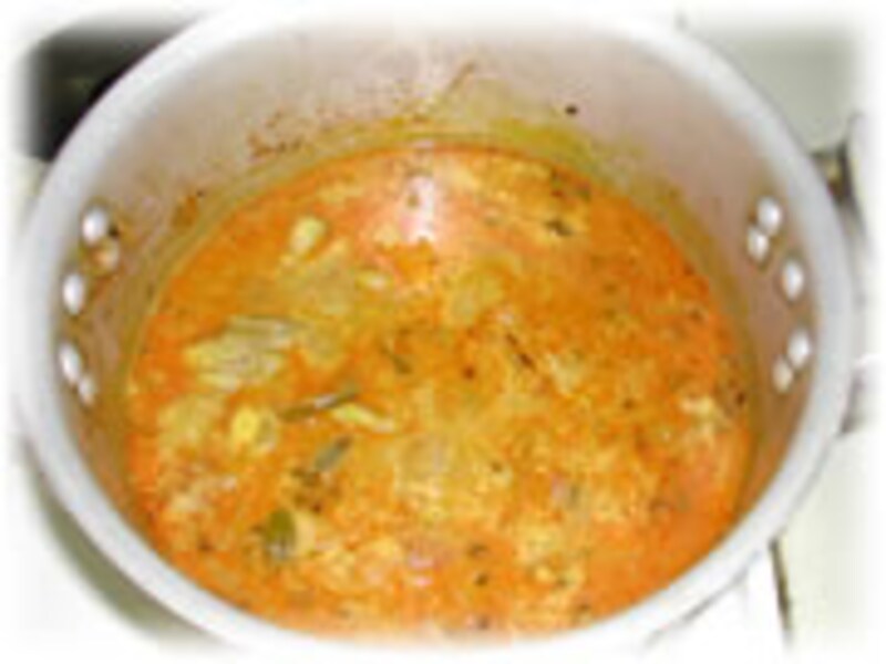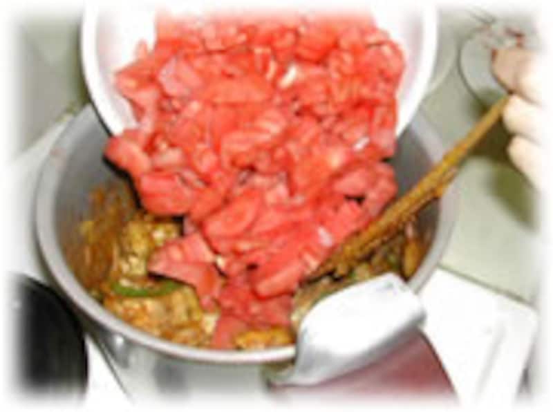 | 6:サイコロ状に切ったトマトを入れて、さっと混ぜ合わせてから蓋をして20分間煮ます。火加減は中火で時々焦げ付かないようまぜ合わせます。 | 7:ココナッミルク1缶と、200ccの水を加え、20~30分間煮込めばできあがりです。 | |