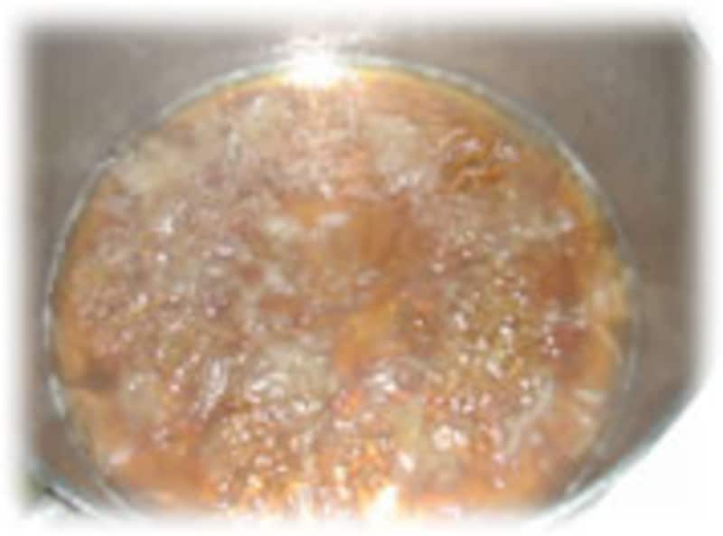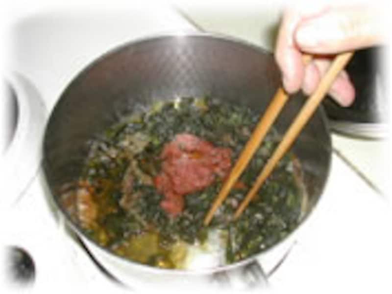 | 3・フキの葉を入れてひと煮立ちしたら、梅干しを入れて弱火で汁気が無くなるまで煮ます。 | 4・梅干しは煮ているうちに種が自然に取れます。ガラス瓶等に入れて冷蔵庫に入れ保存してください。 | |