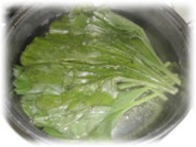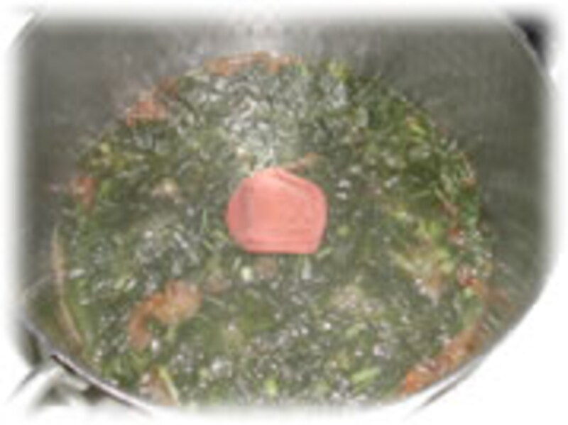 2・ナベに削りかつお節、酒、醤油、砂糖を入れ煮立ったらフキの葉を入れます。 | |