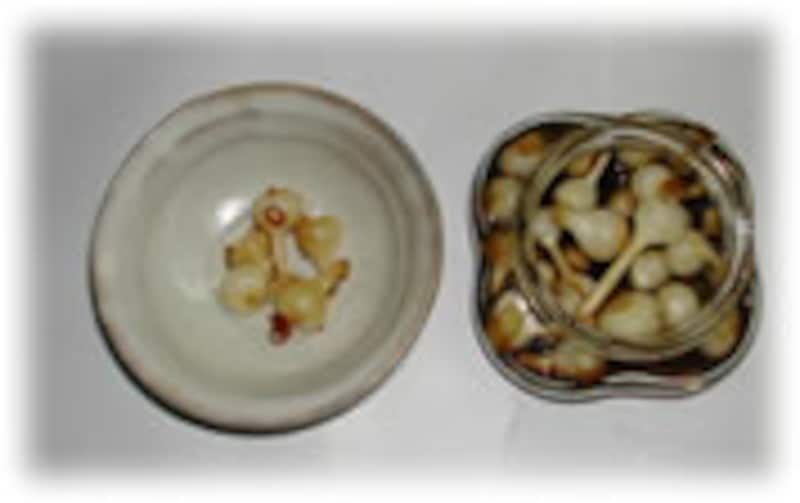 | 採取してきたノビルは、球根部分を切り取りひげ根を落とします。よく水洗いし軽く塩をして、2時間ほどおいてから水洗いします。 | 醤油にミリン、タカノツメを少し加えて、そのまま瓶詰めします。一週間もすれば味がしみ込んでいただけるようになります。 | |