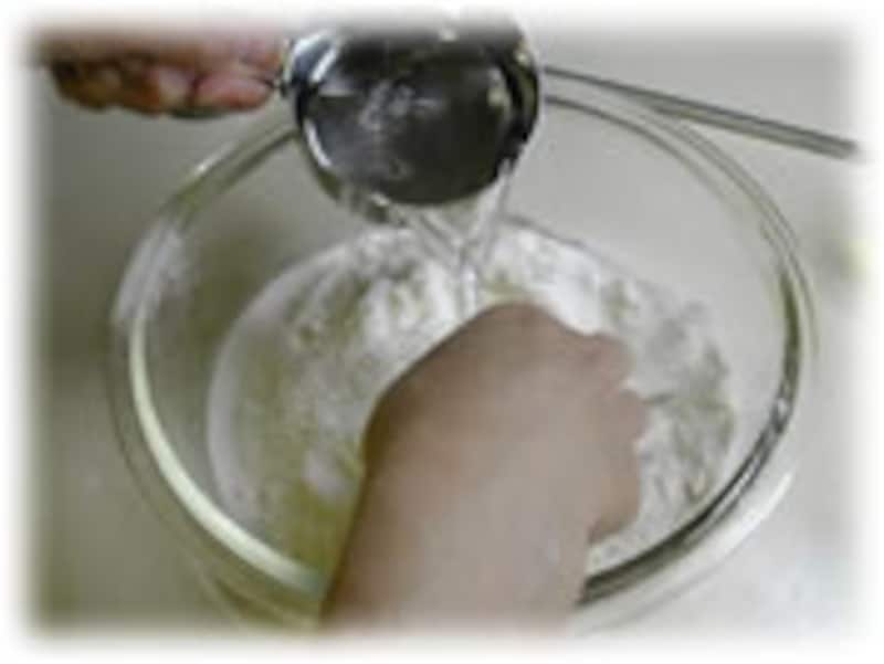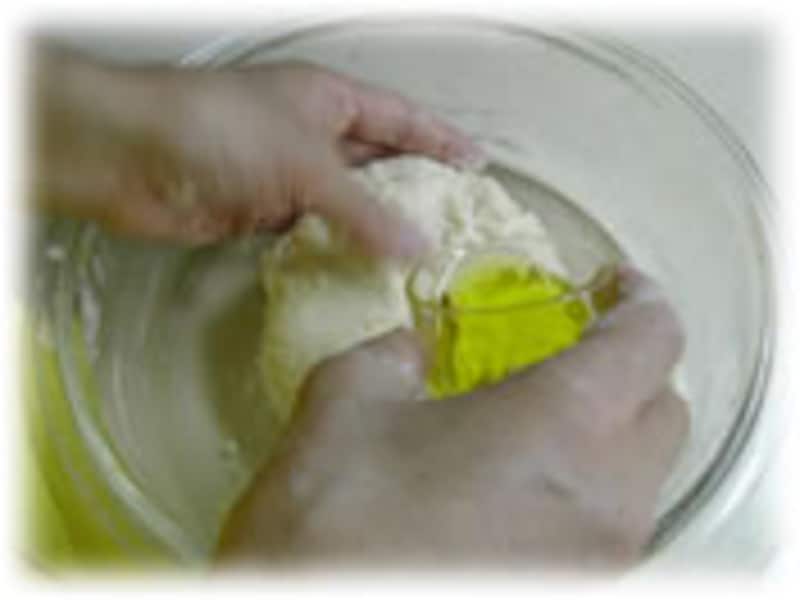 | 2:ぬるま湯は3回くらいにわけて加えます。 | 3:ある程度粉がまとまってきたらオリーブオイルを2~3回に分けて加え、手で押すようによく混ぜ合わせます。 | |