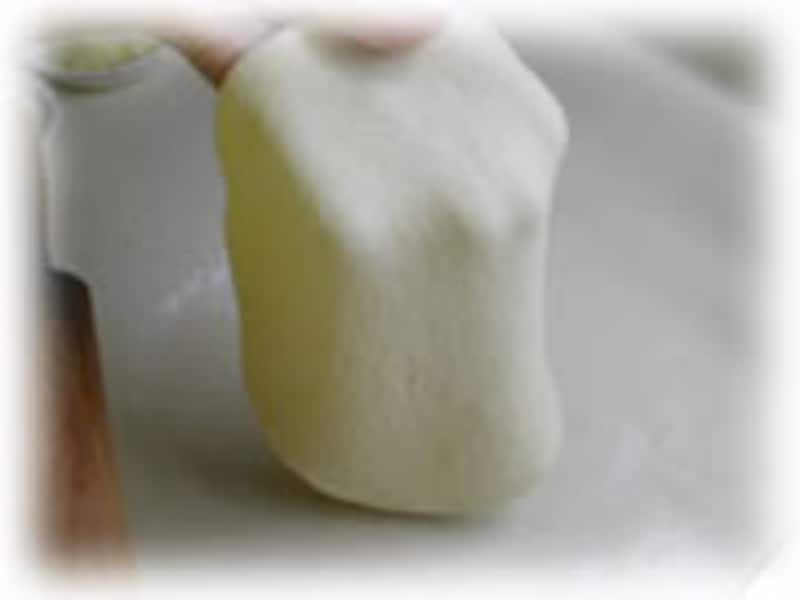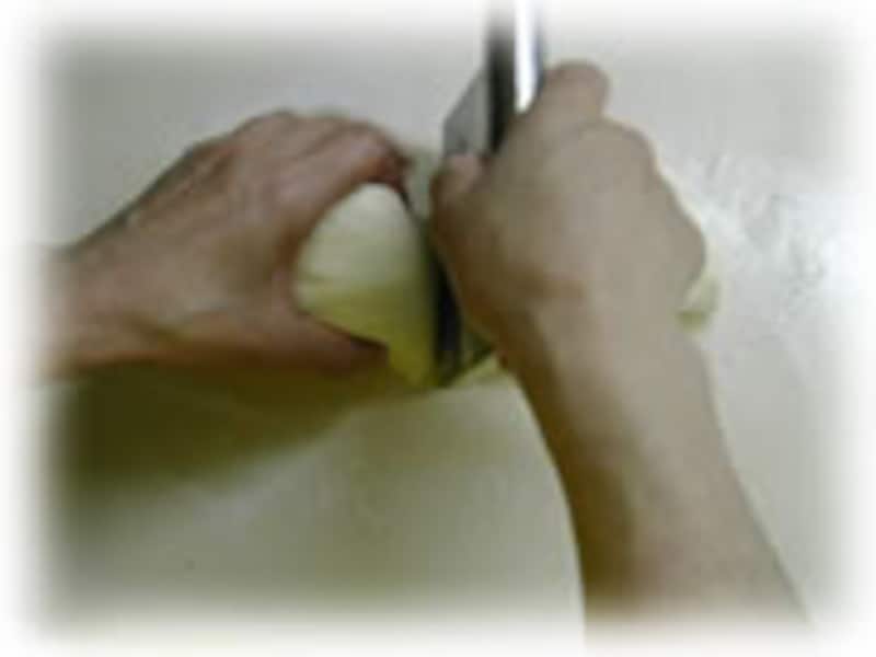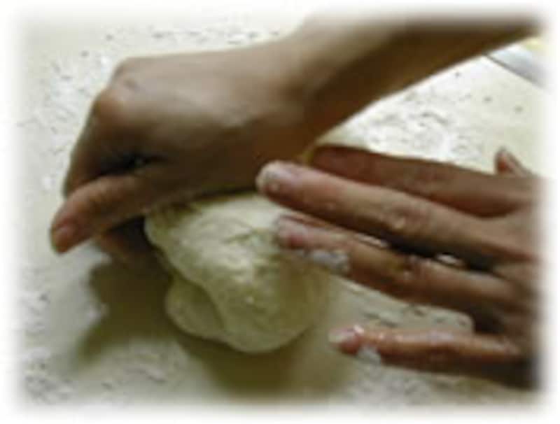 | 4:台の上に打ち粉(薄力粉)をして生地を充分に折っては曲げてを繰り返し10分間くらい充分に捏ねます。 |