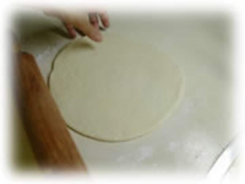 | 6:発酵した生地を台の上に取りだして、二枚なら2等分、4枚作るときは4等分にします。成形しやすいように丸くまるめて5分間布巾をかけておきます。 | 7:台の上に打ち粉をして、丸くまとめた生地を手のひらで押してからめん棒で直径25cmの円形にのばします。 | |
