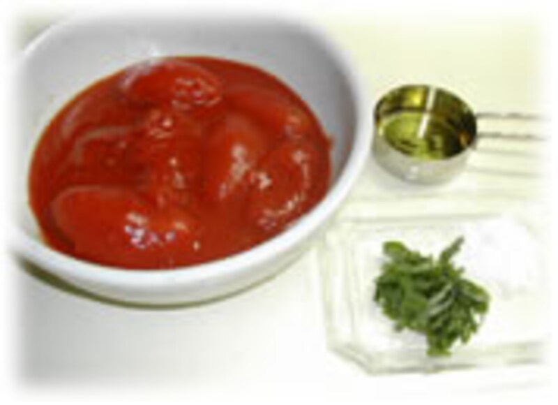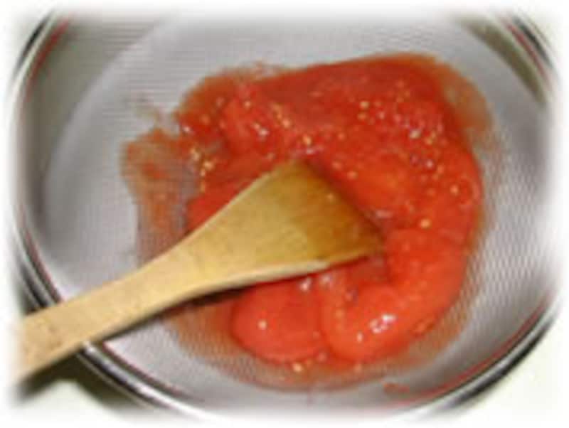 | ピザ用トマトソースの材料:ホールトマト缶詰め400g、オリーブオイル小サジ1、塩小サジ1、バジルの葉3~4枚 | 作り方 1:ホールトマトをザルなどで裏ごしします。 |