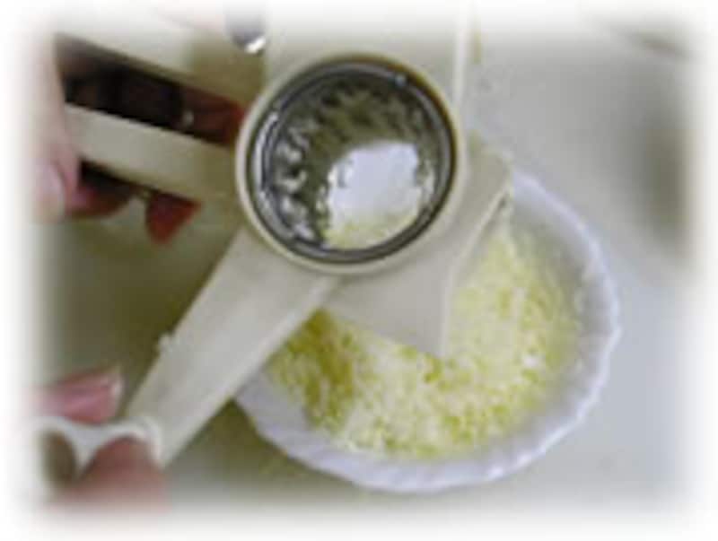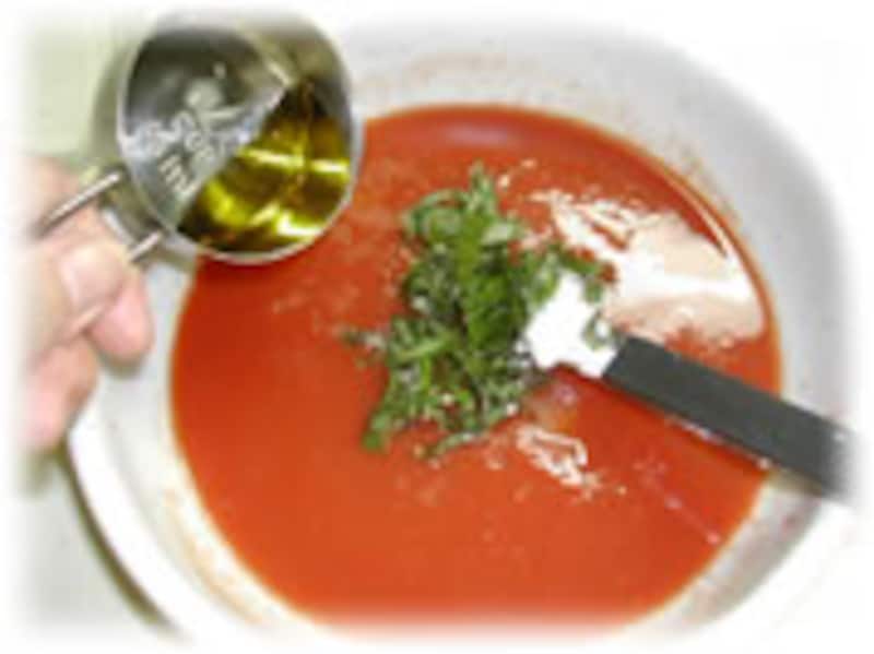 | 2:裏ごししたトマトに塩、オリーブオイル、せん切りしたバジルの葉を加えてよくかき混ぜます。 | 3:モッツァレッラチーズは、余分な水分を取り除いておきます。 | |