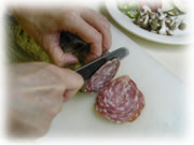 5:ミラノの食材店Peckのサラミを薄くスライス。品のいいサラミの味は格別です。 | |