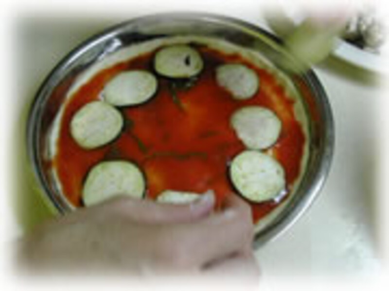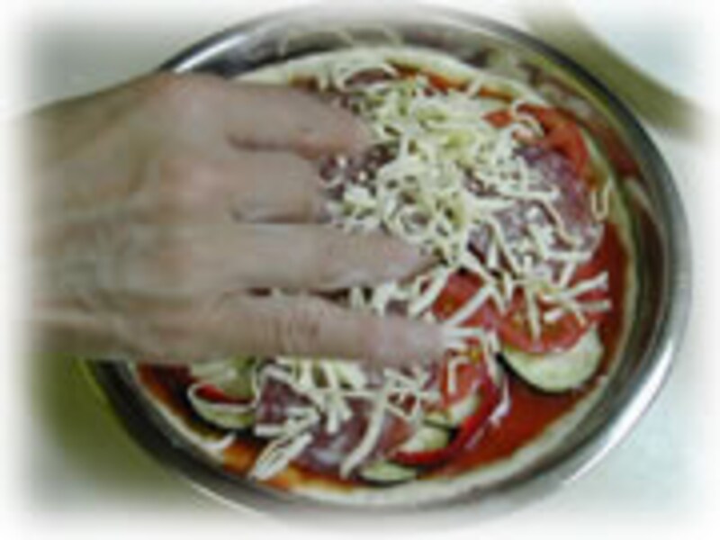 | 6:発酵を終えて、薄く伸ばしたピザの生地にトマトソースをぬり、トッピングの野菜とキノコ、サラミを順にのせていきます。 | 7:トッピング材料は、色々お試しください。最後におろしたチーズをのせてから予熱したオーブンへ。 | |