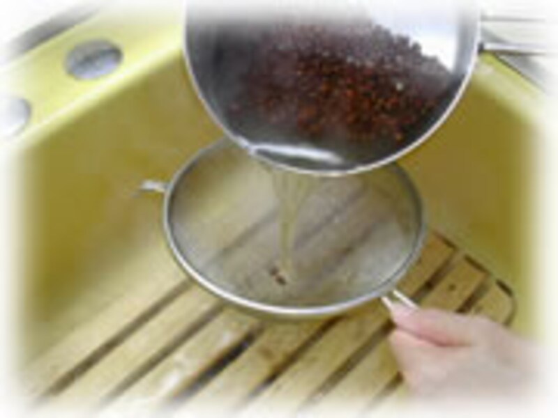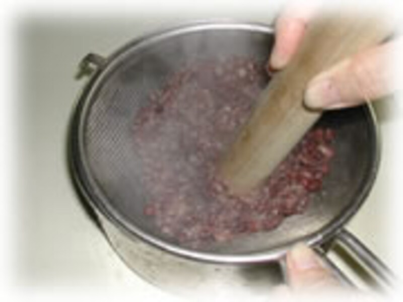 | 煮汁はアズキが少し隠れるくらいの分量を残します。煮上がったアズキをザルにあげ、すりこぎで濾します。 |