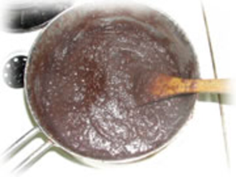 濾したアズキとこし汁に、砂糖300gと塩一つまみを加え、弱火で30~40分水気が飛ぶまで気長に煮詰めます。(焦がさないように気をつけて下さいね) |