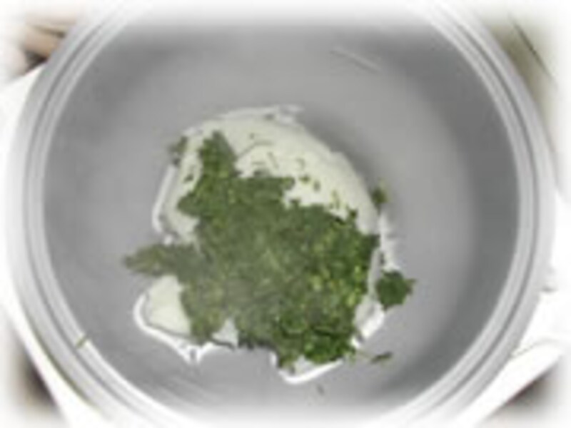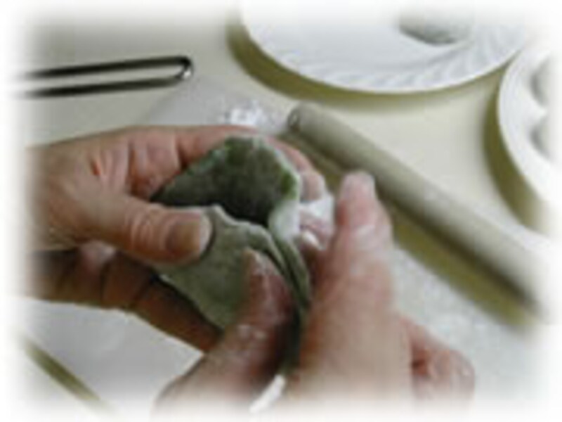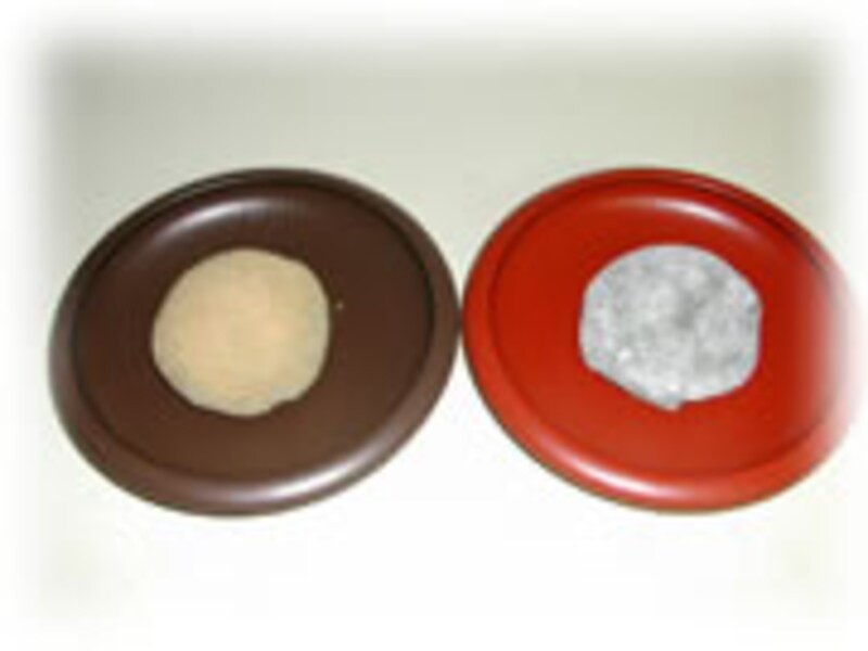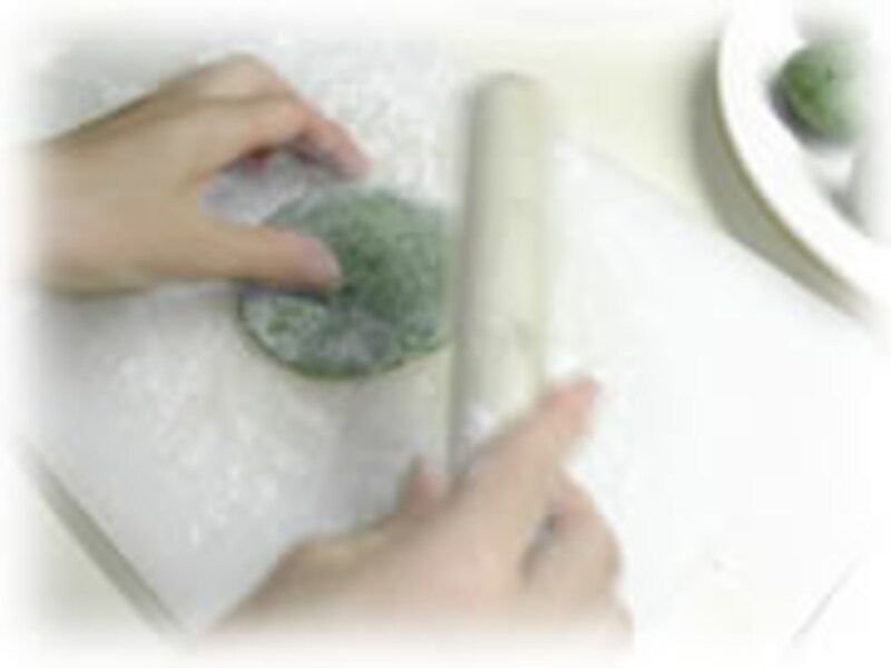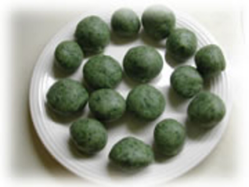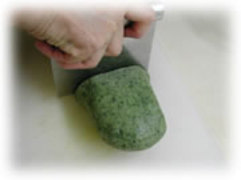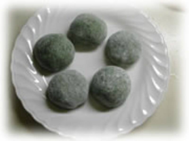 | 裏返して盛りつければ、ヨモギの香り豊かなヨモギ餅のでき上がりです。 | キナコをまぶしたヨモギ餅も作ってみましょう。違った味がお楽しみいただけます。 | |