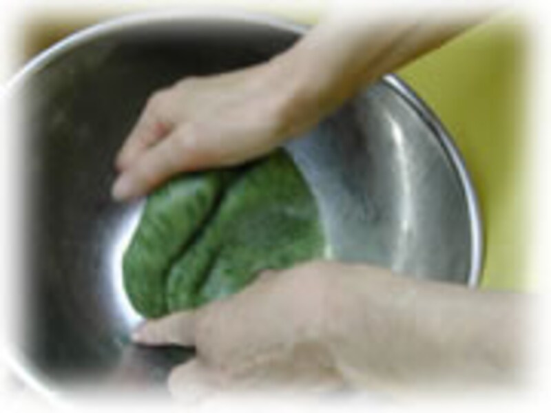 | 前ページで蒸し上げてある程度冷ました餅に、細かく刻んだヨモギを入れて練り上げます。砂糖水を手水にして柔らかくなるまで良く練りあげます。 | 練り上げるのが大変と思い、餅つき器を使おうと思ったのですが、柔らかい餅は充分手で練り上げられます。ヨモギが全体にまわり、きれいな草もちができました。 | |