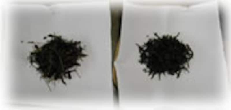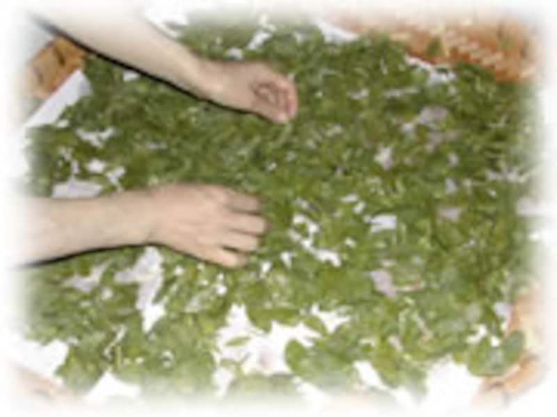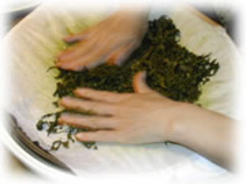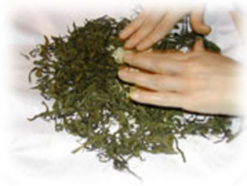| 5・熱いので、気をつけながら手のひらで茶葉を撚っていきます。 | 6・これはかなりの時間がかかりますが、撚れば撚るほどおいしいお茶ができます。茶葉が針金状にまで撚れるようになるには少々経験が必要になります。 | |