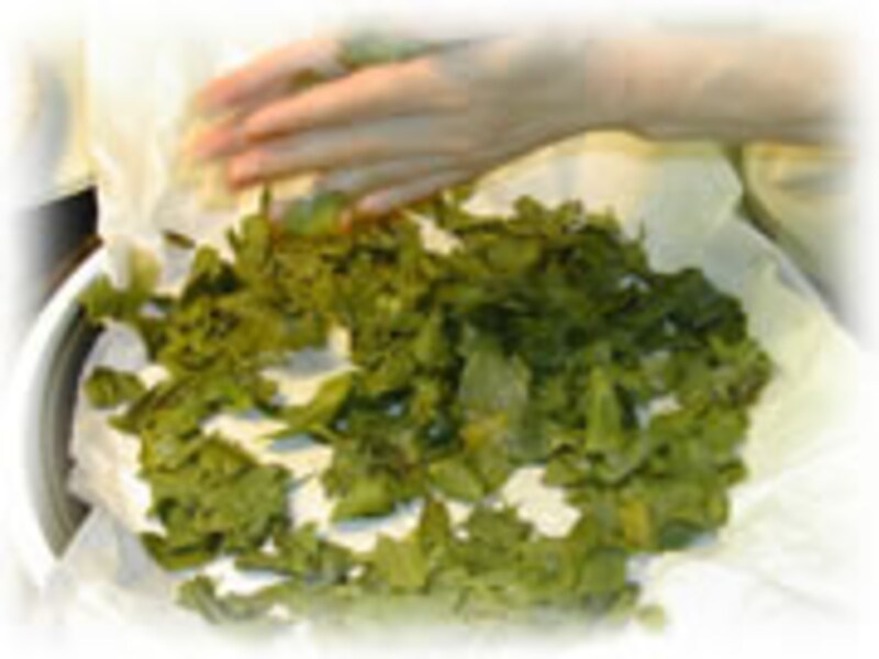| 3・ゆで上がった葉はすぐに冷水にとり、大きなザルにキッチンペーパーを敷き、水気を充分に切ります。次に扇風機を当ててできるだけ早く十分に冷まします。 | 4・ホットプレートの上に和紙を浮かせるようにかぶせて、周りを固定して180℃に暖めた和紙の上に(3)の茶葉をのせて手で軽く撚ります。 ここからは、手が真っ赤になるくらいの熱との戦いが始まります!! |