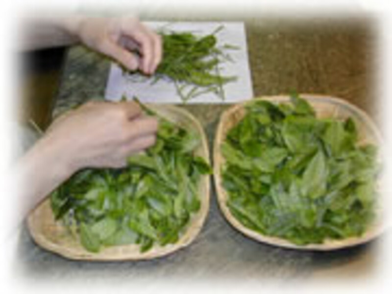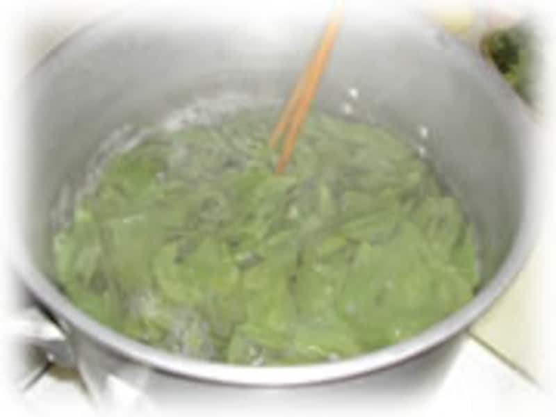 | 1・丁寧にお茶づくりをするために、摘み取った新芽を葉だけにしました。茎は別にして茎茶にします。家庭では一度に大量の葉は処理しきれないので、5回に分けて作りました。 | 2・モノの本には、ここで蒸すとあるのですが、中途半端に蒸すと発酵が進んでウーロン茶や紅茶になってしまいます。今回はいただいたアドバイスどおりに茶葉を湯がきました。 大鍋一杯の水が沸騰したら、茶葉を入れ1~2分茹でます。(葉の発酵を止めるわけです) |