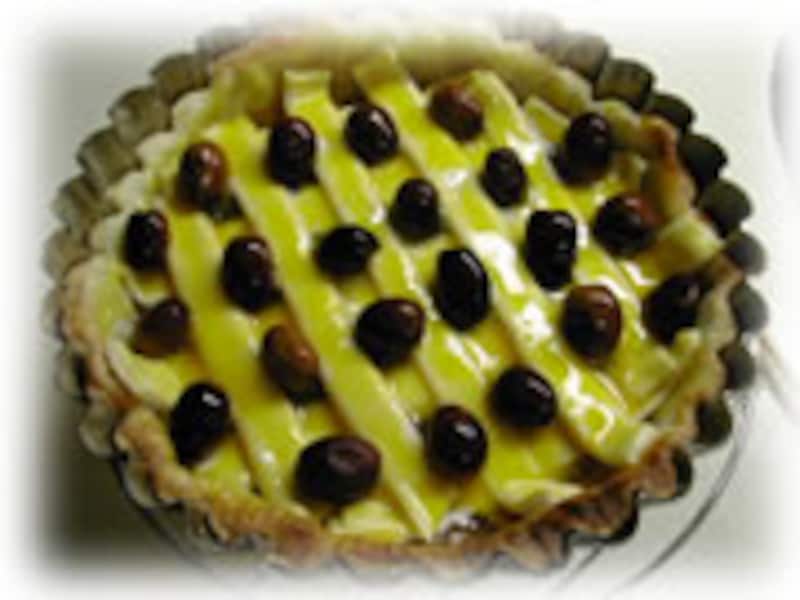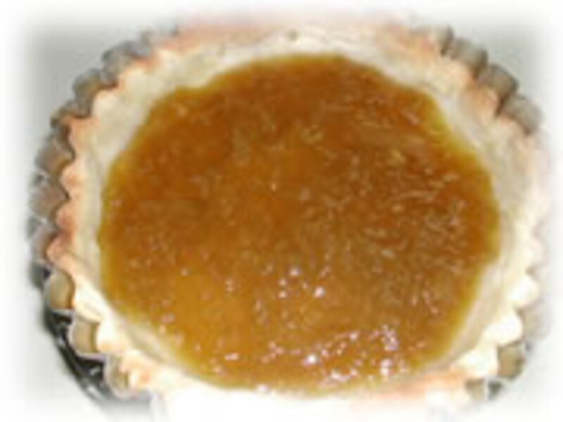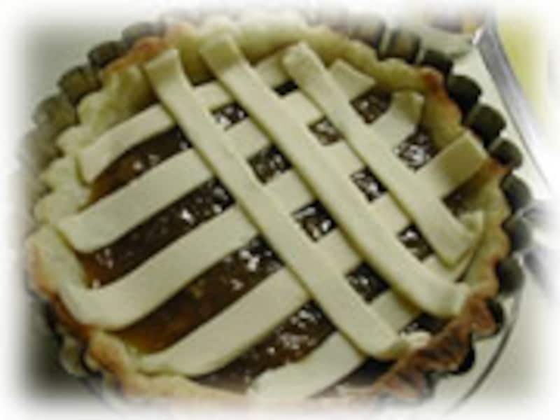 | 材料:直径21cmのパイ皿1枚分 薄力粉200g、バター100g、砂糖30g、冷水100cc、ルバーブジャム250g、ナツメのシロップ漬け25粒、卵1個分の卵黄