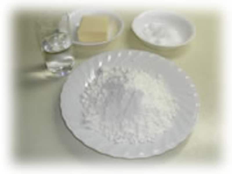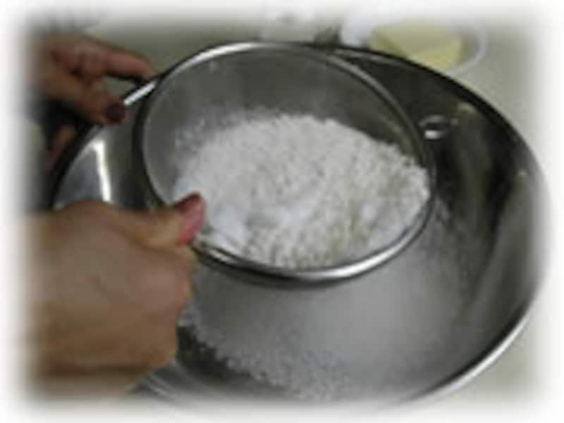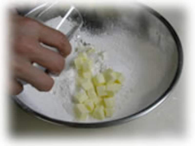 | 1・薄力粉と砂糖は合わせて2回ほどふるっておきます。バターは2cm角のさいの目に切り、バターもふるった粉も冷やしておきます。 | |