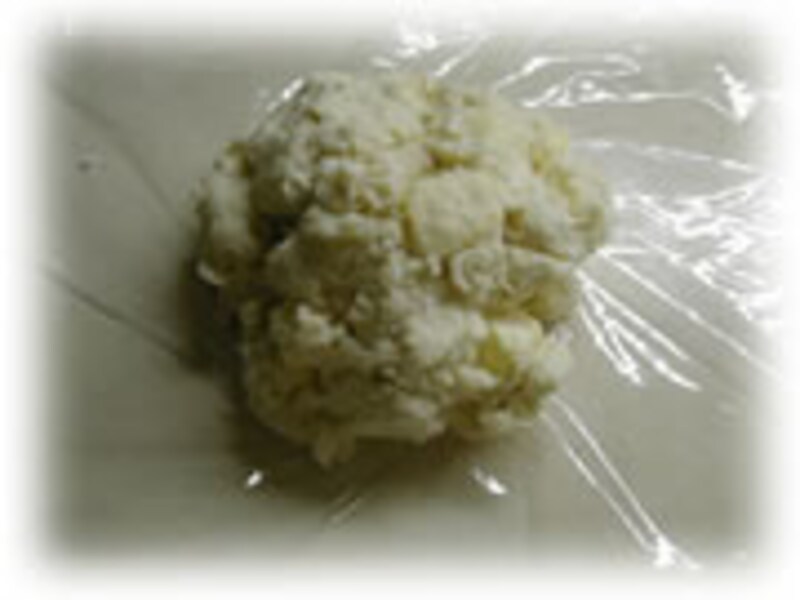 | 2・ボールも冷やしたものを使い、粉とバターに冷水を少しずつ加え、練らないように両手でざっくりと混ぜます。 | 3・バターの塊が残っていて、生地がパラパラの状態でひとまとめしたものを、ラップに包み冷蔵庫で30~40分間ねかせます。 | |