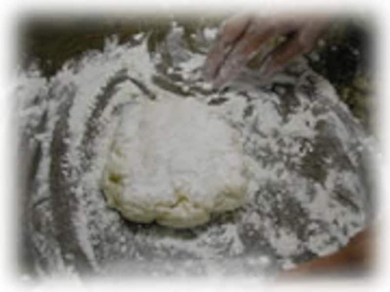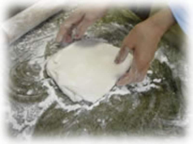 | 4・打ち粉をした台の上で、冷やしたままの生地をのせ、生地の上にも打ち粉をして、めん棒を使い3mm程度の厚みになるまで慎重に伸ばします。 | 5・伸ばした生地を半分に折り、打ち粉を振り、また半分に折り重ねます。 | |