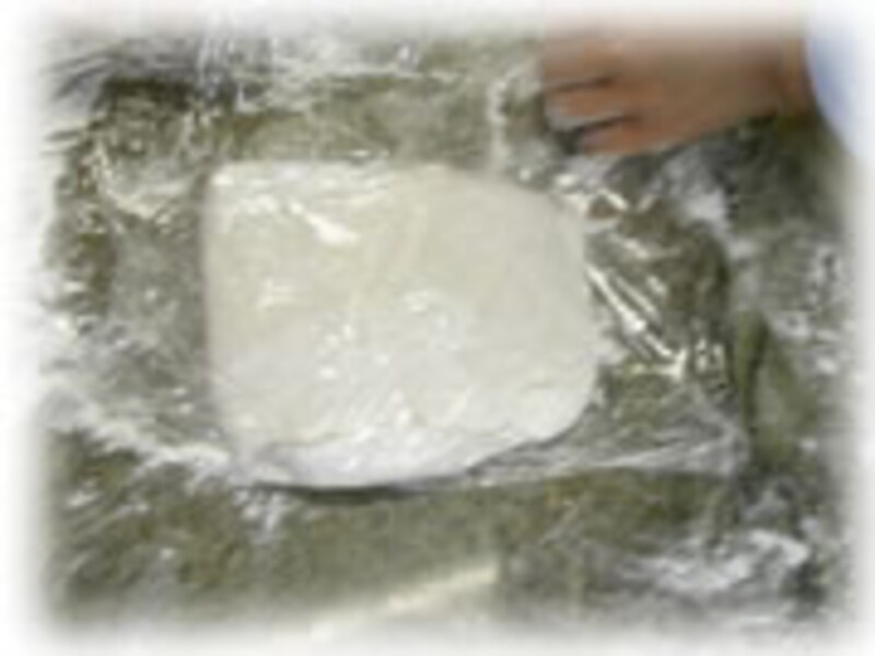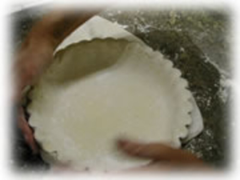 | 6・4つ折りにした生地を、再びラップで包み冷蔵庫で冷やします。(4)~(6)をもう一度繰り返します。 | 7・平らに伸ばした生地をパイ型の上にそーとおき、指で型に沿うように押し付けていきます。余分な生地を取り除きます。この部分は後で飾りの帯に使います。冷蔵庫で15分程休ませます。 | |