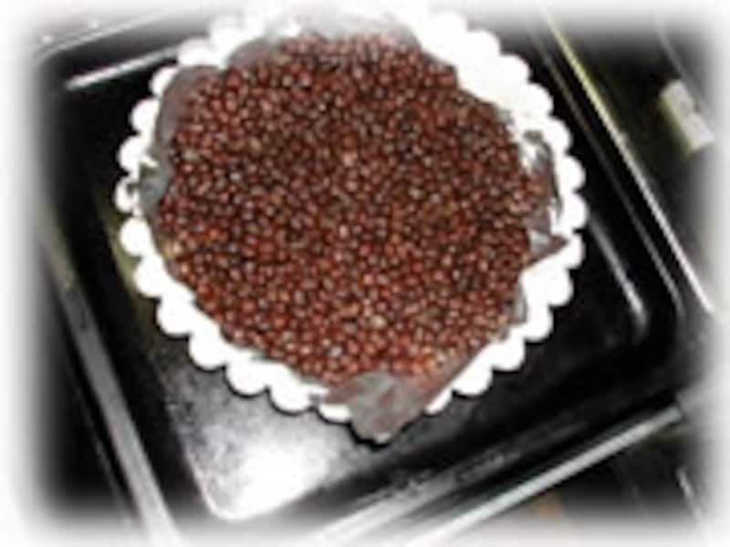 | 8・生地をから焼きします。アルミホイルを生地の上にかぶせて、重し(クズ豆でも大丈夫です)をして、180℃のオーブンで20分間焼きます。 重しをするのは、底の部分を焼いて形を整えることと、生焼けにならないようにするためです。 | 9・から焼きしたパイ生地は、重しをとり充分に冷ましてから、ルバーブジャムを均等に盛り付けます。 | |