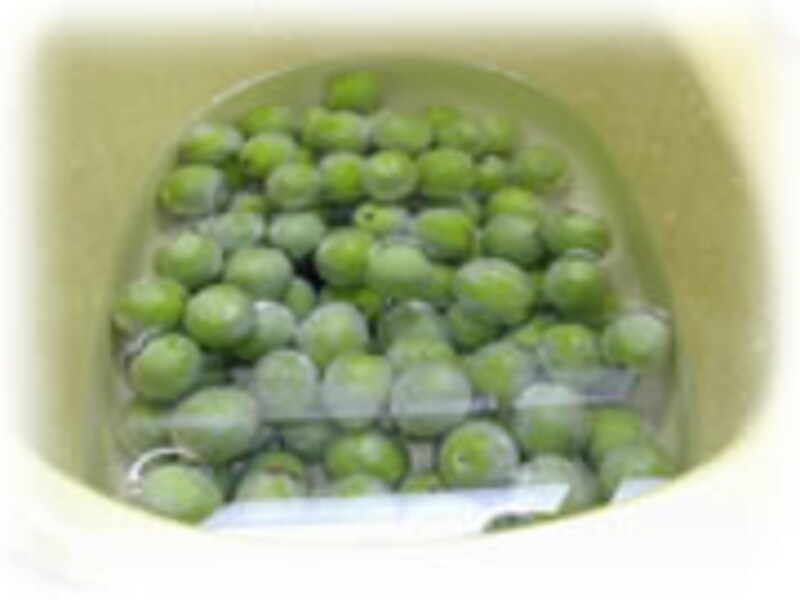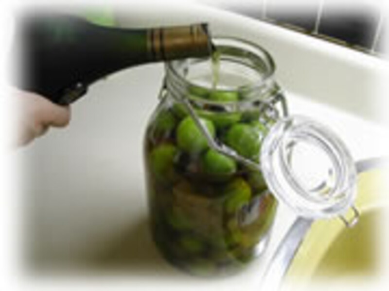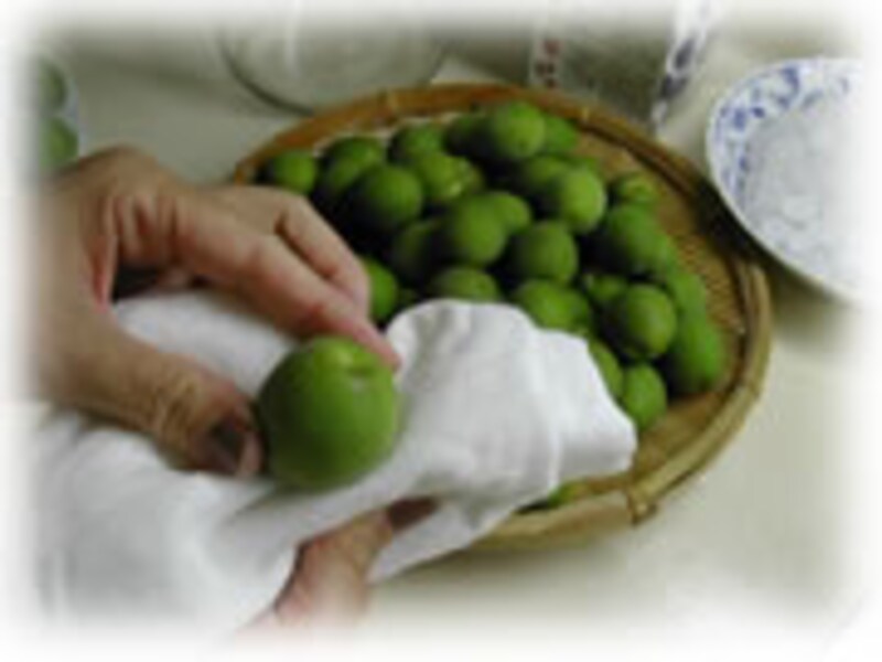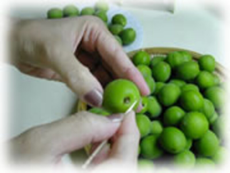 | 材料:青梅1kg、氷砂糖600g、ブランディー1.8リットル | 1・青梅は、表面に傷をつけないように注意しながら、よく水洗いをします。 | |