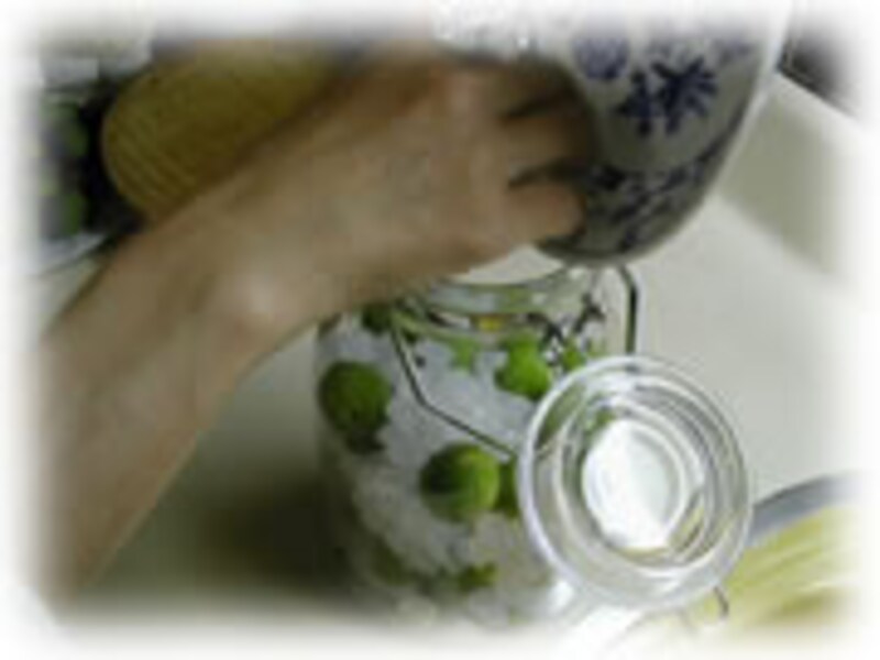 | 4・熱湯消毒をして、乾かしておいた広口ビンに、梅と氷砂糖を交互に入れていきます。 | 5・ブランディーをゆっくりと注ぎ入れます。 | |