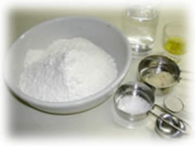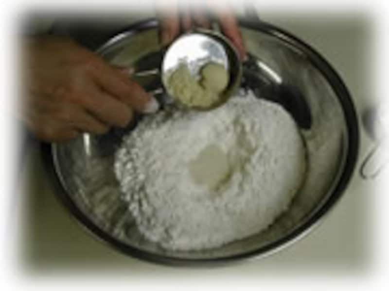 作り方:(1)ボールに強力粉を入れ、真ん中にくぼみを作って、砂糖、塩、ドライイーストの順に入れて、混ぜ合わせます。 | |