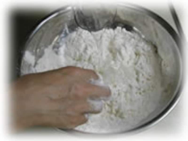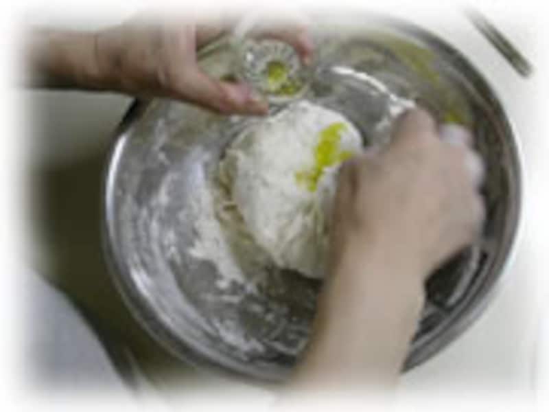 | (2)ぬるま湯を2~3回にわけて加えます。粉がある程度の塊になるまで、指先を使って混ぜあわせます。 | (3)粉がよく混ざって滑らかになったら、オリーブオイルを加えます。 | |