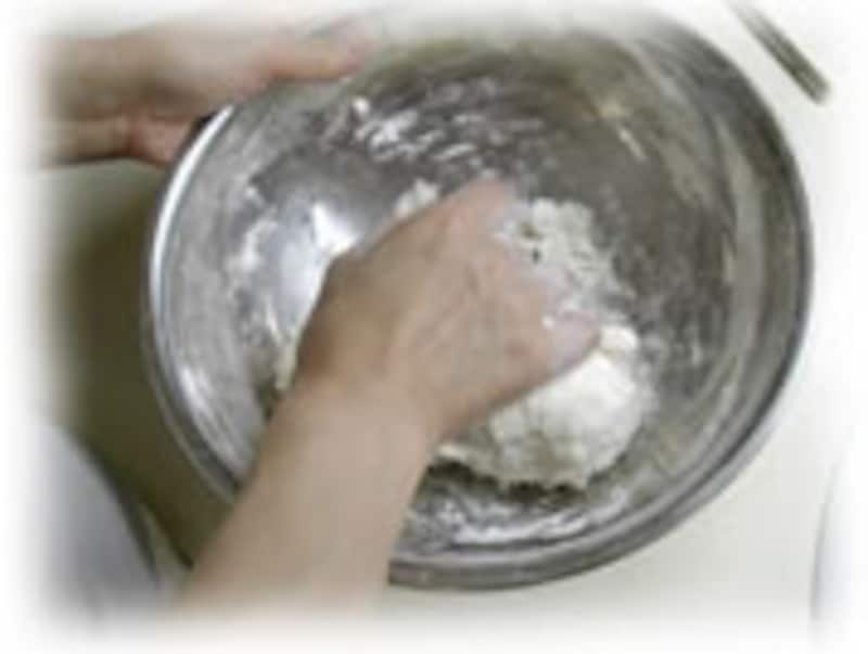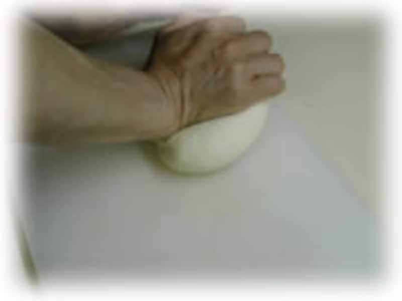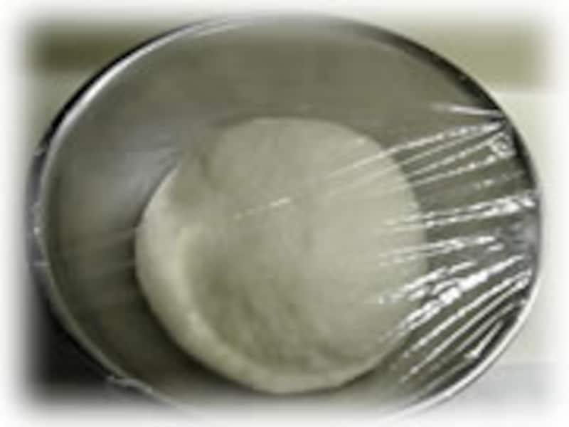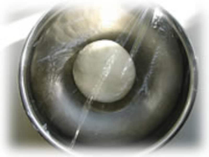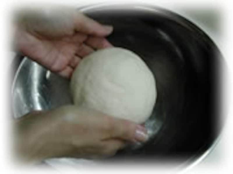 | (6)充分に捏ねられた生地は触っていても弾力があります。生地を丸くまとめて一次発酵に移ります。 | (7)ボールにオリーブオイルを薄くぬり、生地を転がして全体に油がつくようにします。これは生地の乾燥を防ぐためと、発酵した生地をとりだしやすくするためです。ボールにラップをかけます。 | |