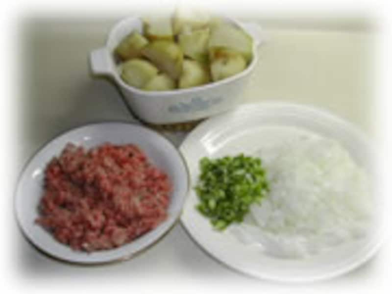 コロッケの材料:じゃがいも大5個、ミンチ肉300g、タマネギみじん切り1個分、ピーマンのみじん切り3個分 塩、胡椒 |