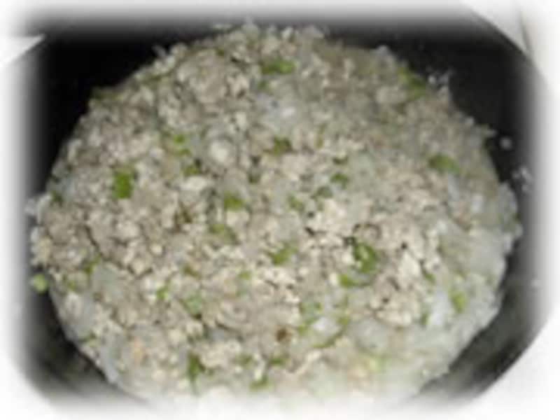 熱したフライパンにバター大サジ1を入れ、タマネギを炒め、次にミンチ肉、ピーマンを炒めて塩・胡椒で味をととのえ、冷ましておきます。 |