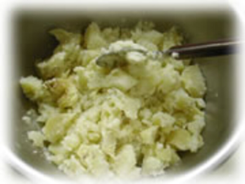 | じゃがいもはきれいに洗い、電子レンジで約10分加熱してから、熱いうちにマッシャーやスリコギなどで突き潰しておきます。 | 潰したじゃがいもが冷めきらないうちに、炒めた具を汁ごと混ぜ合わせて形をつくります。お好みで具を混ぜ合わせるときにカレー粉などの香辛料や、ハーブなどを混ぜるのもいいでしょう。 | |