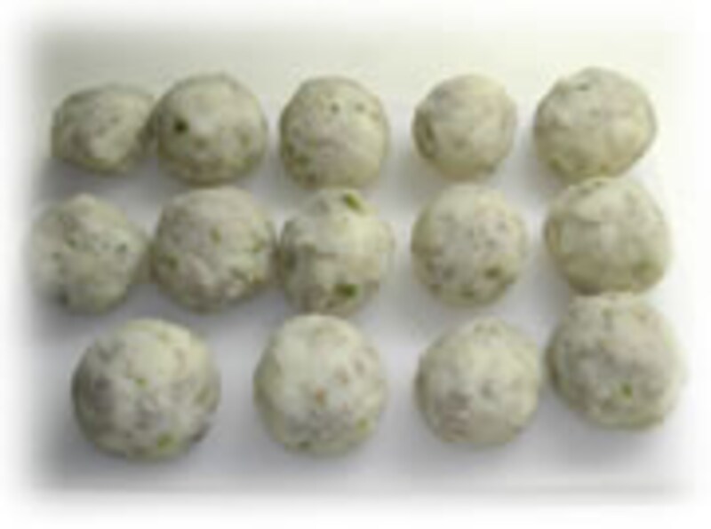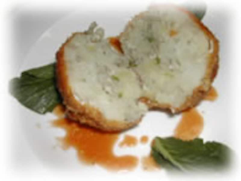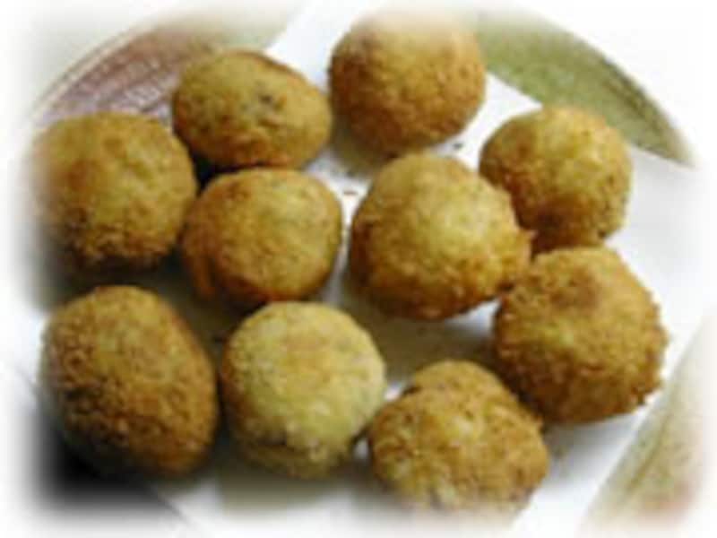 フランス料理にでてくるクリームコロッケは、鳥肉、エビ、カニ、ゆで卵、マカロニ、タマネギなどを下ごしらえしてから、濃いめのホワイトソースで和えて、丸く形づくり衣をつけて油で揚げます。 |
