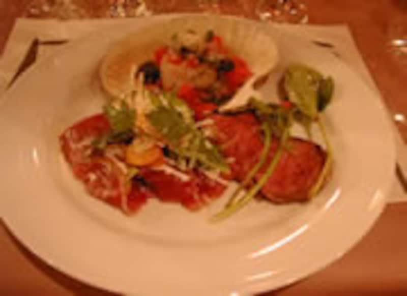 | まず、オードブルには帆立貝とローストビーフ、そして本まぐろのカルパチョからどうぞ、デリケートな三つの味の出会いに、まず驚かされます。 | 何とフォアグラを、春巻きの皮に似た薄皮で茶巾のようにくるみ、オーブンで焼き上げたもの。パリッとした焼きあがりと、フォアグラが、特上の味をかもし出してくれます。 | |||||||||||||||||||||||||||