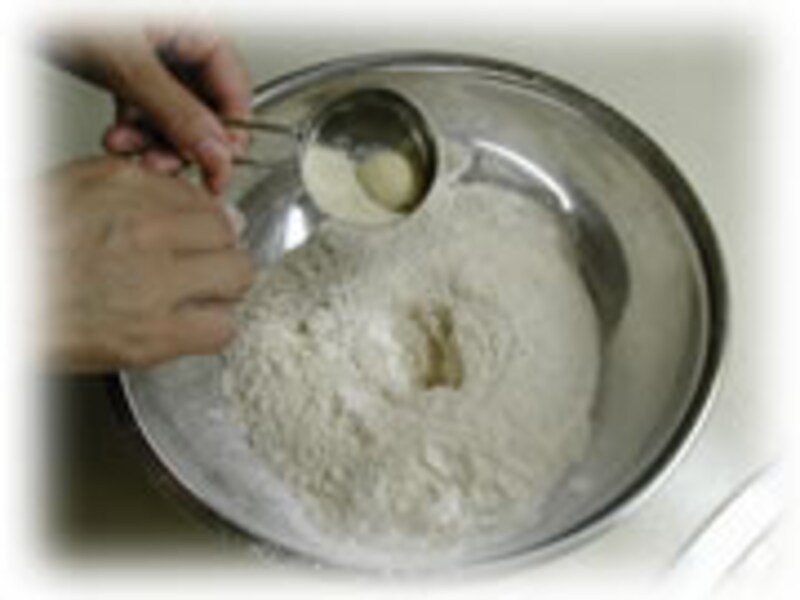 | 2・ふるった粉の真ん中にくぼみを作りドライイースト、砂糖、溶きほぐした卵を加えます。 |