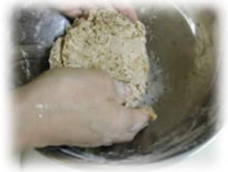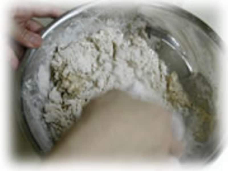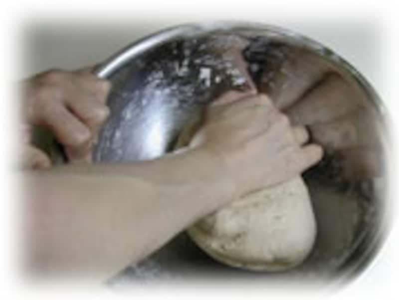 | 4・ボールの中で粉全体がまとまるように捏ねます。 | 5・ボールの中で、体重をかけながら、手の平で押すようにして生地を伸ばし、たたみを繰り返し20分間程よく捏ねます。 | ||||