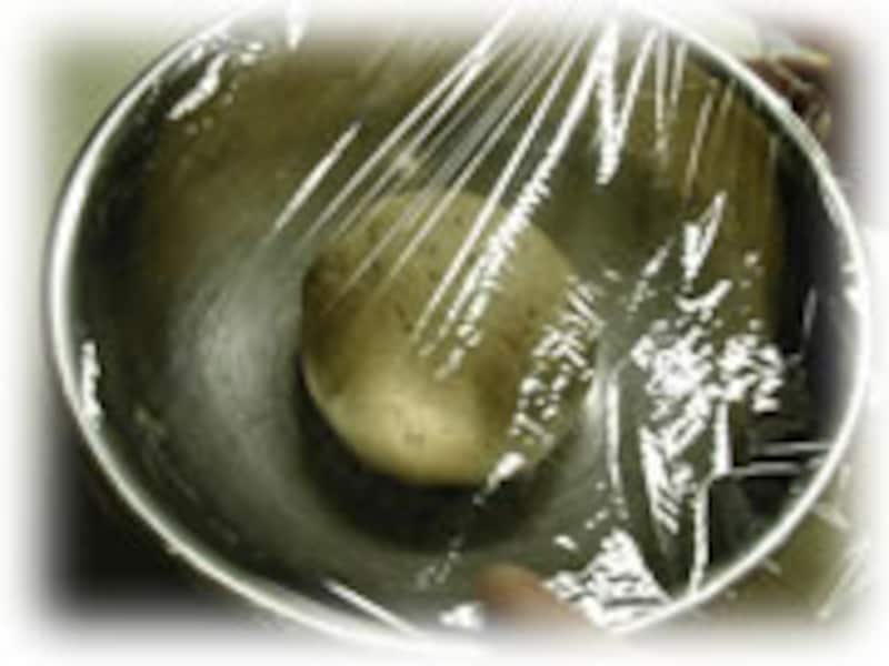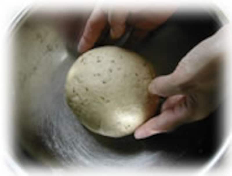 | 6・充分に捏ねられた生地はこの写真の感じ。端を巻き込むようにして丸めてとじ目を指でしっかり閉じておきます。なめらかで弾力があります。 | 7・ボウルにオリーブ油をぬり、生地を転がして表面に油の膜を作り乾燥を防ぎます。ラップフイルムをかぶせ、夏場ならそのまま1時間ほど一次発酵します。冬場は、湯煎や発酵温度のオーブンで発酵させます。 | ||||