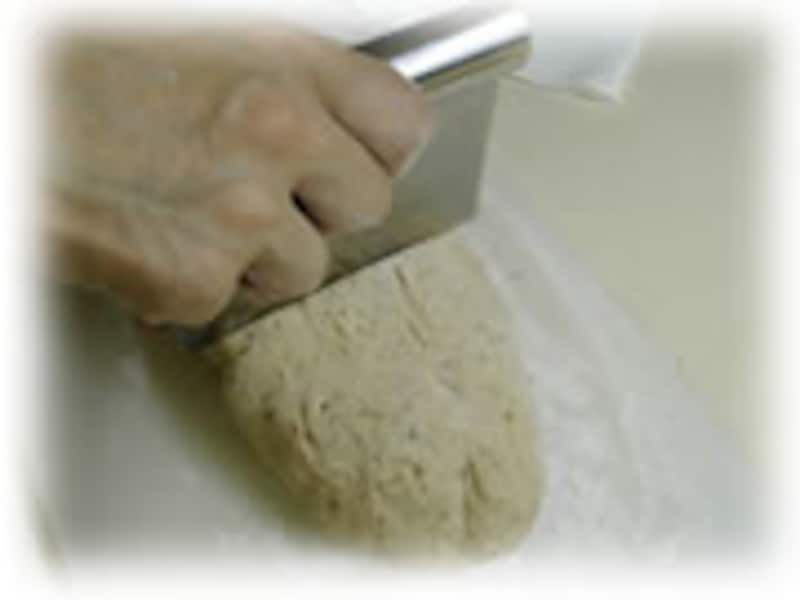 | 7・一次発酵をおえた生地は約2倍の大きさに膨らんでいます。フィンガーテストで穴がふさがらなければ発酵終了です。 | 8・生地をとりだして、スケッパーで2等分します。 | |
