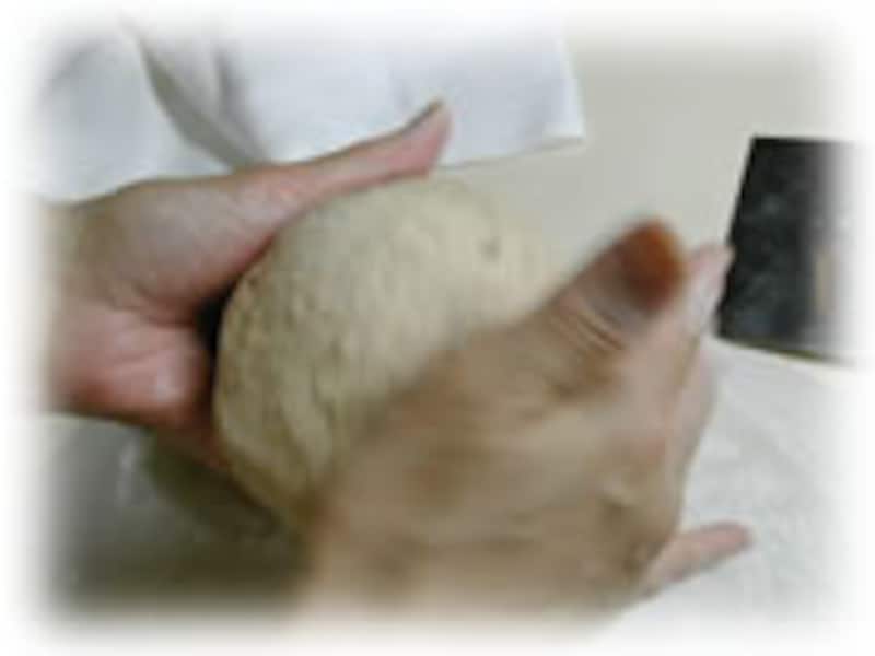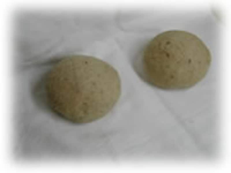 | 9・切り口を下に巻き込むようにして丸くまとめてとじ目を指でしっかりとまとめます。 | 10・厚手の布巾の上で20分間ほどベンチタイムをします。上にも布巾をかけて乾燥を防ぎます。 | |