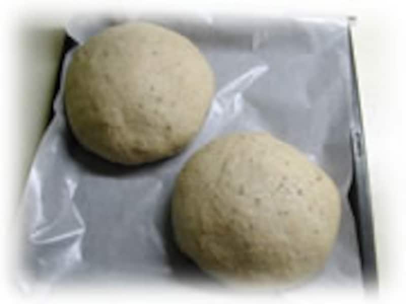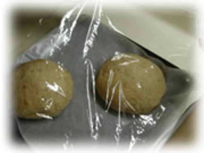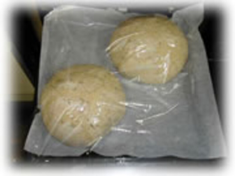 | 11・天板にクッキングシートを敷き、生地をのせ、ラップフイルムをかぶせて1時間ほど二次発酵をします。発酵温度は28℃です。 | 12・二次発酵をおえた生地は約1.5倍くらいの大きさになっています。 | |