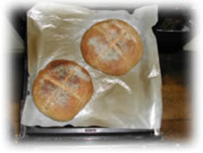 | 13・表面にナイフで十文字に切れ目をいれます。パンに艶を出すために水を霧吹きでかけ、けしの実を飾ります。 | 14・200℃に温めたオーブンで約25分間焼きます。 | |