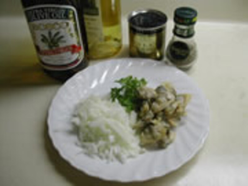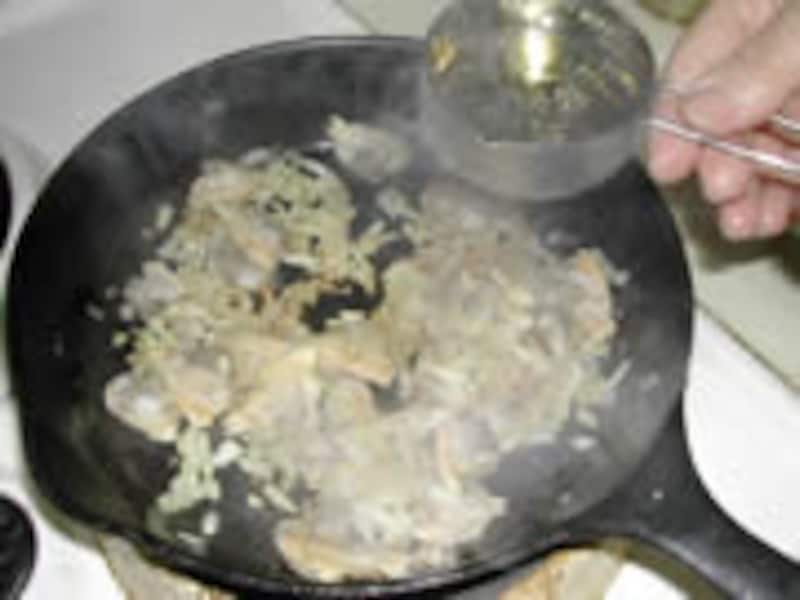 | 2・むき身のあさりを入れて軽く混ぜ合わせ、白ワイン100ccを加えます。 | 3・フタをして2~3分間むらし、塩・コショウで味をととのえます。 | |