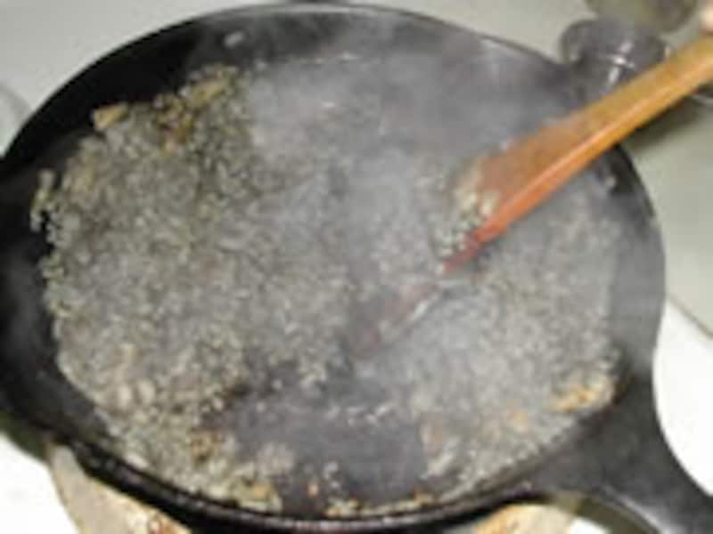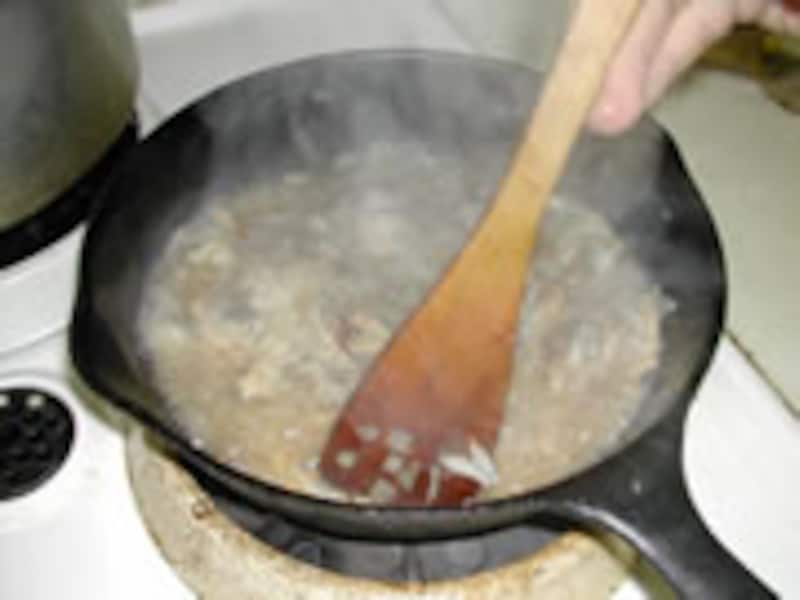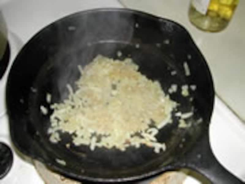 1・フライパンを温めてから、オリーブオイル大さじ1で、細かく刻んでおいたニンニク、たまねぎのみじん切りをキツネ色になるまで炒めます。 | |