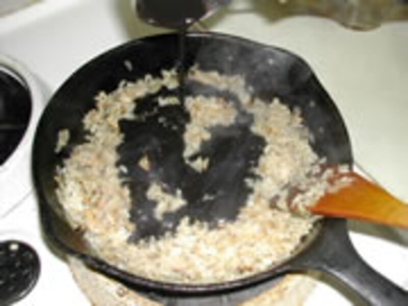 | 4・4人分の玄米ご飯を加えて、具とご飯をよく混ぜ合わせてからイカスミソースを加えます。 | 5・イカスミソースが全体に絡まったらでき上がりです。 | |