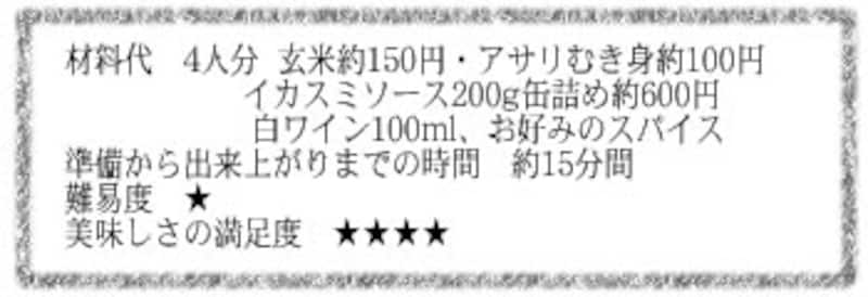 材料4人分:玄米ご飯4杯分、あさりむき身200g、たまねぎ1/2個、ニンニク1片、イカスミソース100cc、白ワイン100cc、塩・コショウ少々、オリーブオイル大さじ1、パセリ少々。 |