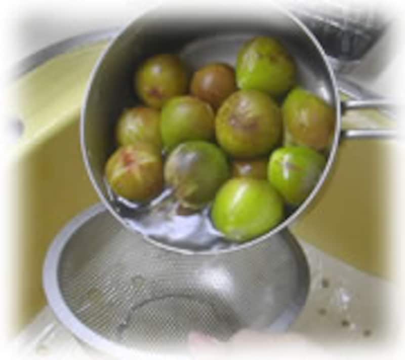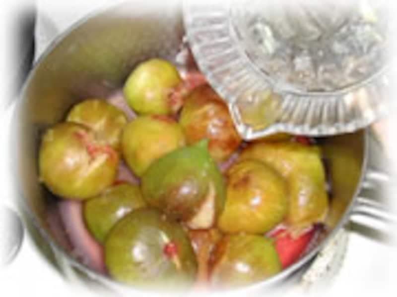 | 1・イチジクは洗って鍋に皮のまま入れて、かぶるくらいの水で強火にかけます。 | 2・煮立ったら、ザルにあげます。 | |