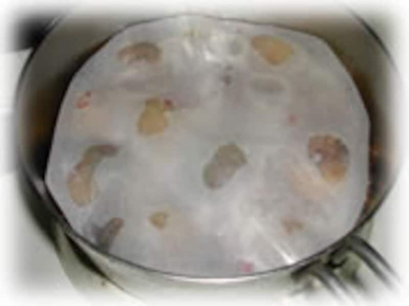 | 5・落とし蓋をして弱火で30分静かに煮ます。 | 6・充分に冷めてから、煮汁ごと冷蔵庫で保存します。 | |