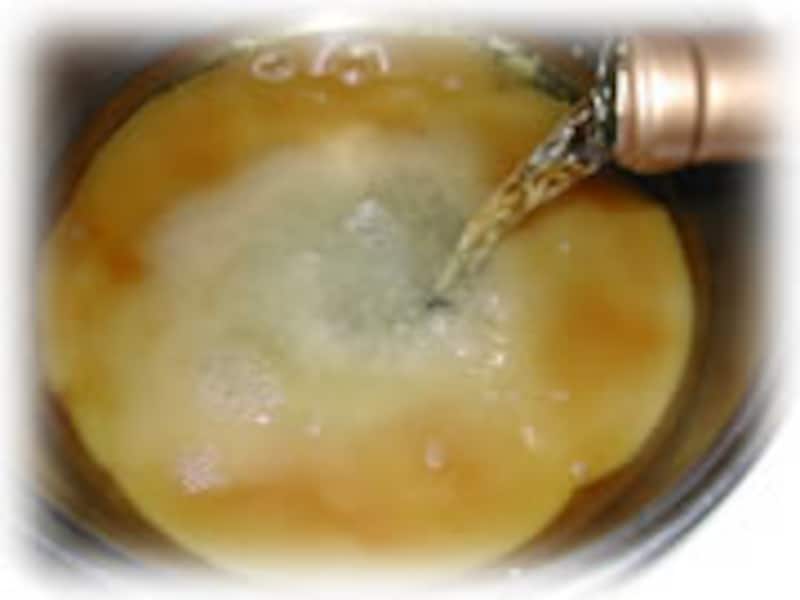 1・鍋に三温糖を入れ、白ワインを加えて煮溶かします。 |